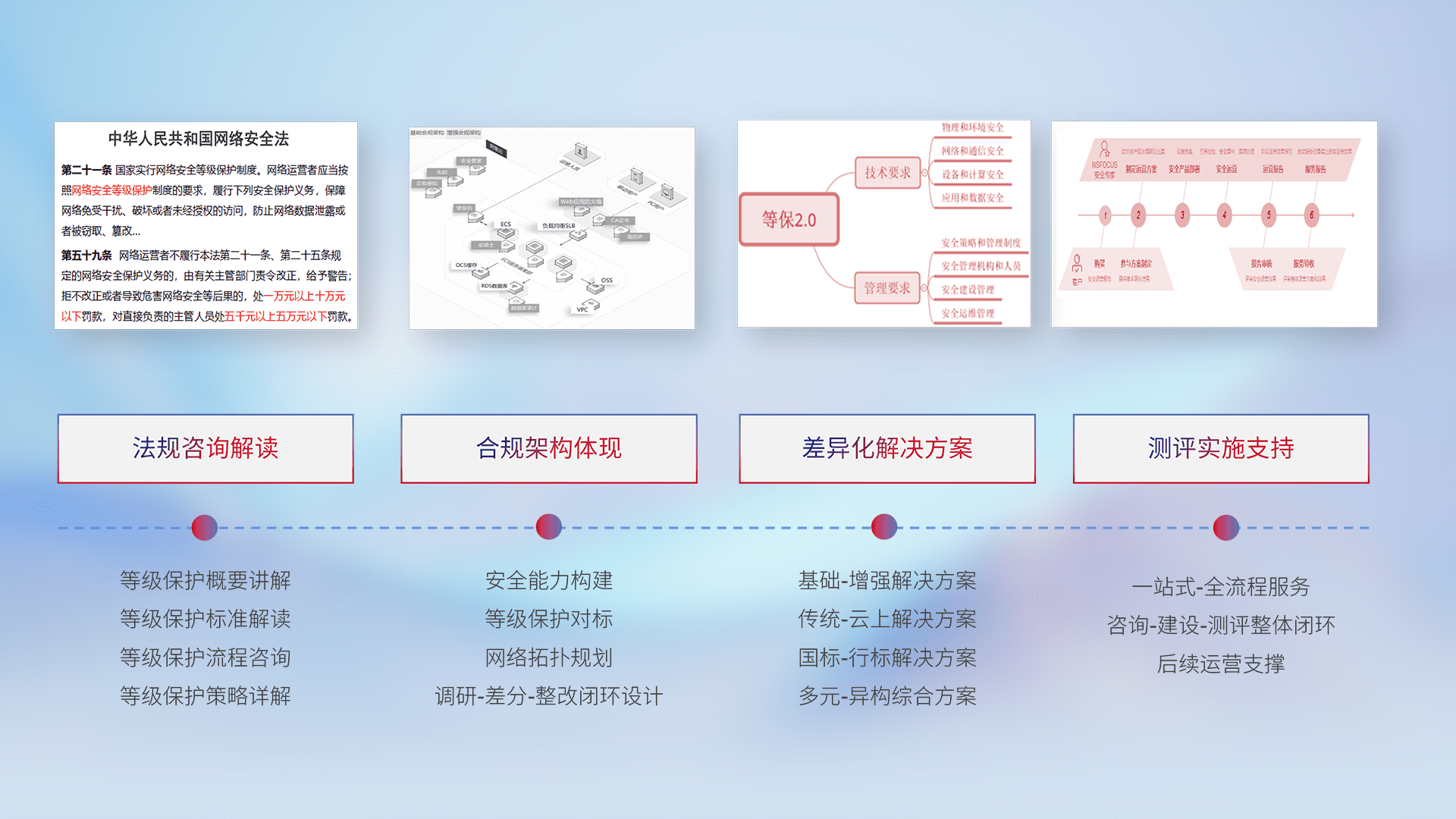 通过专业的法律咨询解读、、合规架构体现、、、差异化解决方案、、、、测试实施支持等服务,,,为客户量身打造等保合规体系。。。
